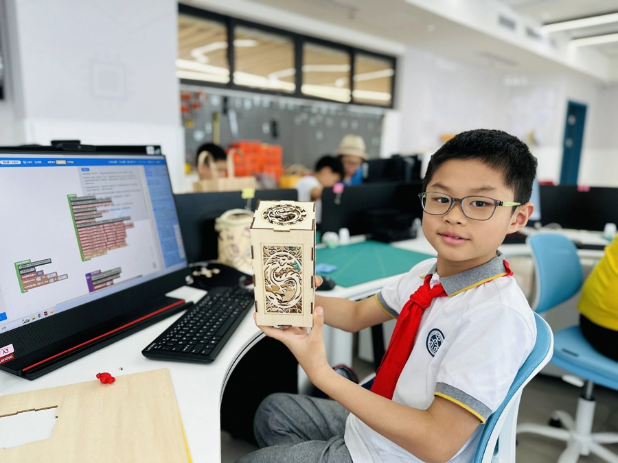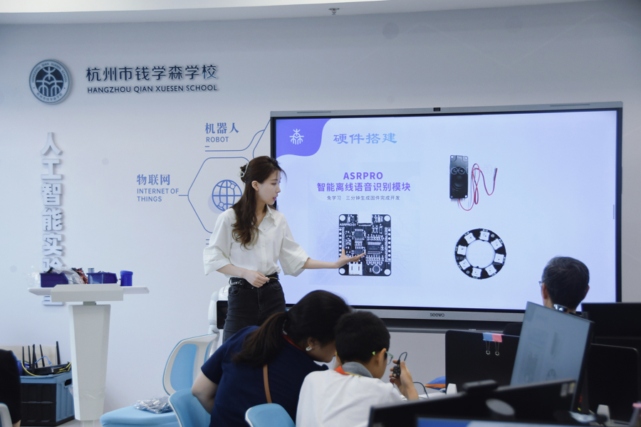 在杭州钱学森学校,过去几个学期,人工智能相关课程一直是社团课的热门选择。“小许同学,变红!”“森森,开灯!”人工智能教室里,孩子们此起彼伏地对着自己制作的小灯发出指令。这节课,由信息科技课教师陈佳慧指导5年级学生制作AI语音控制灯。一位男孩腼腆地解释:“我姓许,所以我的小灯叫‘小许同学’。”通过编程,将人工智能离线语音模块连接电脑、扬声器,这盏灯不仅能够开关、变色、调节明暗,甚至还能背诵出一整首《春晓》。